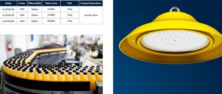 Safood high bay light is the new designed series which cover 100W/ 150W/200W, light efficacy is 150lm/W. lumen output from 15,000lm to 30,000lm. Installation height can be 6 meters to 12